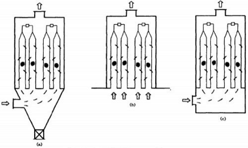(4)進氣和排灰部分:可分為三種,如圖2所示,①UF(FM)型如圖所示,下部為敞開式,清灰時粉塵直接從花板卸出進入庫、倉等。花板法蘭直接座在庫、倉排氣口,排氣直接通過花板孔,進入濾袋。②UF(STD)可下接灰斗,主要用庫底及輸送設備的揚塵點。③UF(FB)型帶有儲灰箱,主要用于濃度不高的通風口氣體凈化。