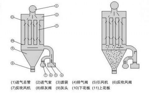 (2) 清灰及自動控制: 除塵器進(jìn)行一段時(shí)間后,濾袋內(nèi)表面捕集的粉塵增厚,除塵器的運(yùn)行阻力上升,當(dāng)增加一定值后,這就需要對除塵布袋進(jìn)行清灰,即通過外力將濾袋內(nèi)表面上附著的粉塵清除掉,使除塵器的運(yùn)行陰力下降,陰力下降下一定值后,該室濾袋又投入正常運(yùn)行。