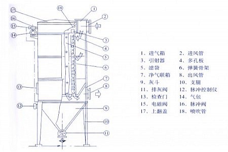 當(dāng)含塵氣體由上箱體進(jìn)入除塵器后,由上而下流動(dòng),經(jīng)布袋過濾以后,粉塵被滯留在袋外,凈化后的空氣則由布袋下口的凈氣聯(lián)箱匯集后,從出風(fēng)口排出。當(dāng)布袋表面負(fù)荷的粉塵增加,達(dá)到一定阻力時(shí),由控制儀發(fā)出指令,按順序觸發(fā)和電磁閥,開啟脈沖閥,使氣包內(nèi)的壓縮空氣從噴吹管各噴孔中以接近音速的速度噴出一次氣流,從而誘導(dǎo)幾倍于該氣流的二次氣流一起噴入濾袋,造成濾袋瞬間急劇膨脹,從而使附著在濾袋上的粉塵脫離布袋,通過凈氣聯(lián)箱之間的間隙落入灰斗然后由排灰閥排出。